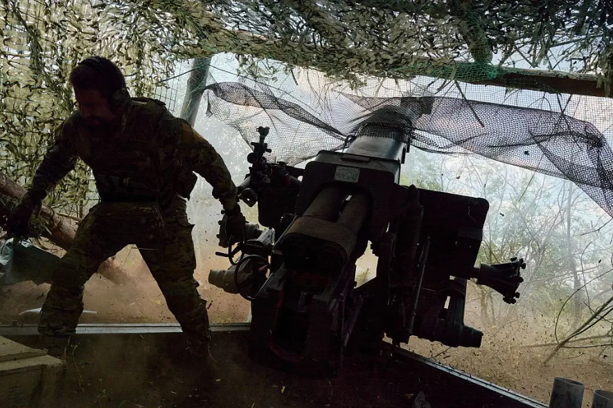 2025 年 8 月 16 日,乌克兰武装部队炮兵在乌克兰顿涅茨克州向俄罗斯入侵部队发射一门 122 毫米榴弹炮 2A18 (D30)